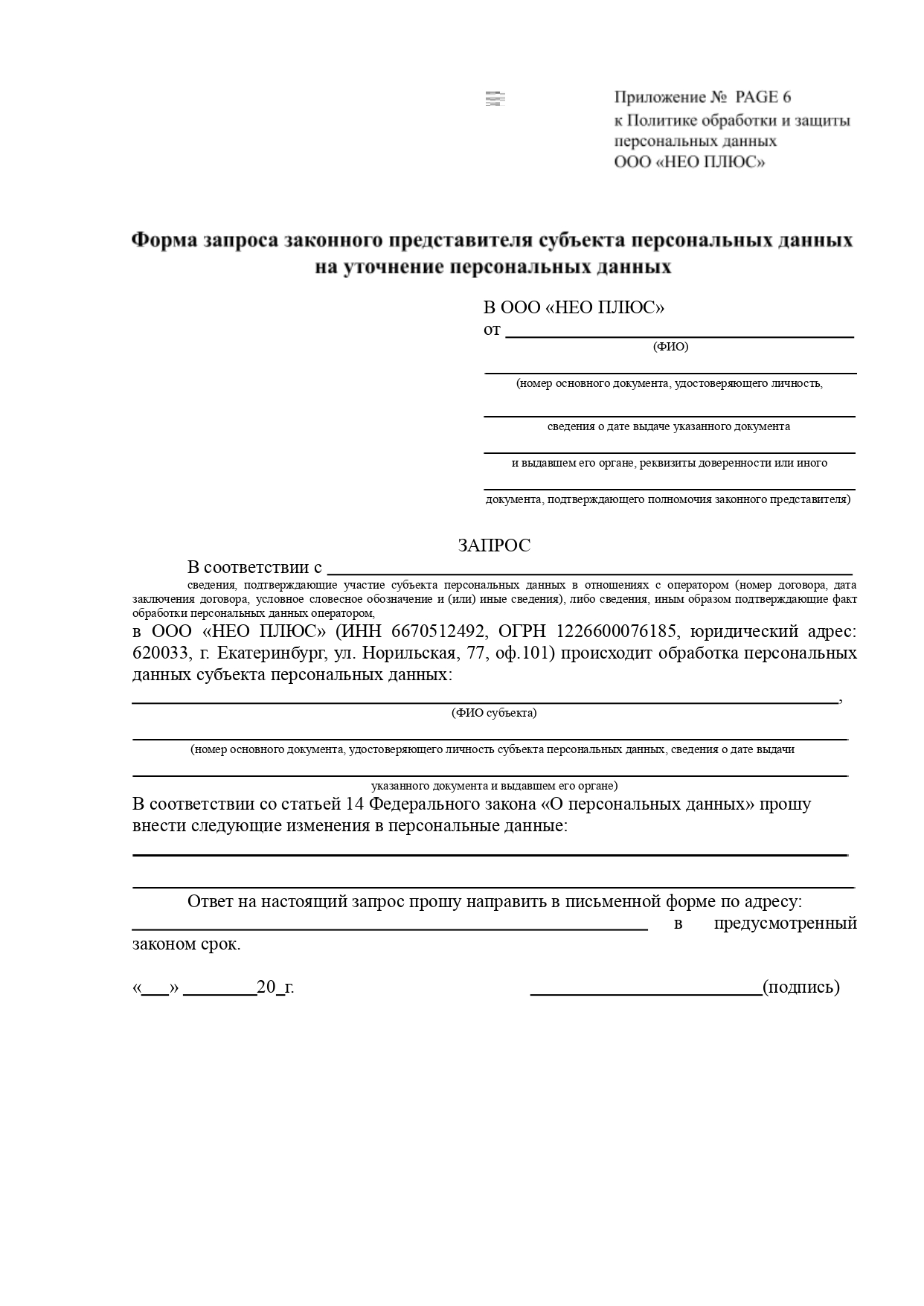 6.9. Для уточнения определенных персональных данных Субъекту (либо законному представителю) необходимо заполнить соответствующую форму запроса субъекта персональных данных на уточнение персональных данных (приложение 2 или 6) и передать лично работникам ООО «НЕО ПЛЮС», принимающим обращения граждан, либо по почте.